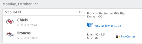 Pick: Kansas City (I like 4-0 on 40 date numerology against Broncos too much)