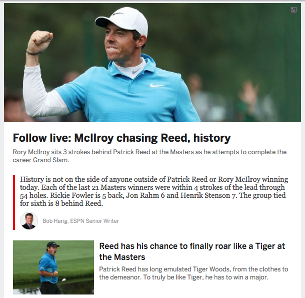 58 76 119 187 | Patrick Reed, who emulated Tiger Woods, leads The Masters on the last day, April 8, 2018 +Masters leader board